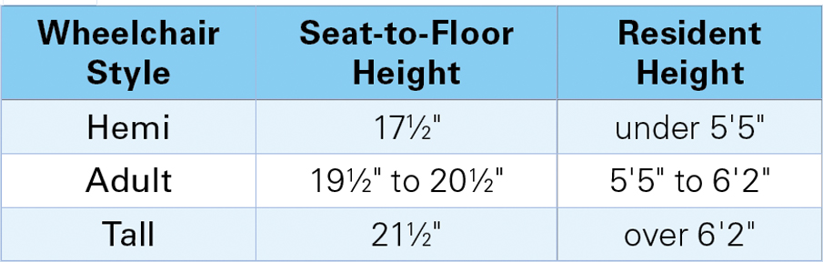 - If resident is under 5′5″ tall, use a Hemi size wheelchair with a 17½” seat height