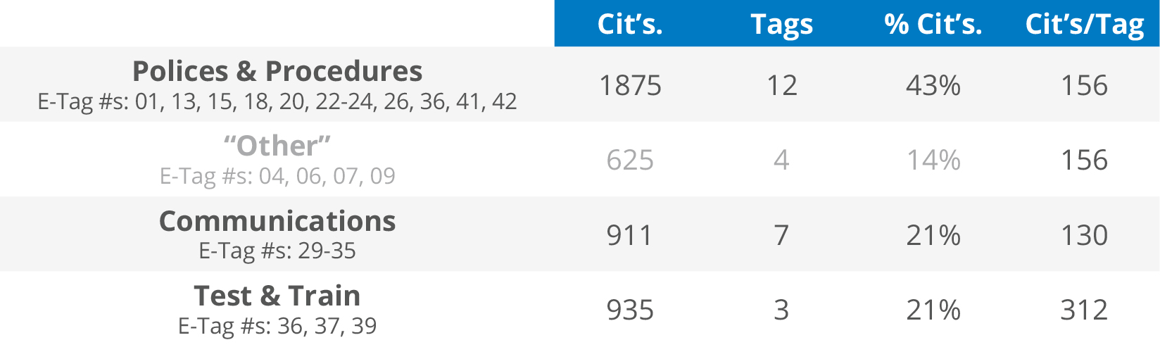 A third, and perhaps a more revealing perspective, is the number of citations issued per E-Tag in the four categories. In that light, it’s all about Testing & Training with 312 citations per tag compared to half that number for the other 3 categories. Add to that a few of the candid remarks surveyors have shared regarding the Testing & Training, and this needs to be an area of focus for everyone.