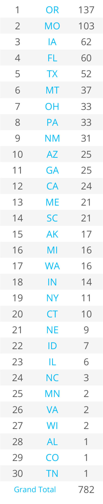 – California had 892 citations (or 19% of the total) - The bottom 11 states totaled 42 two citations