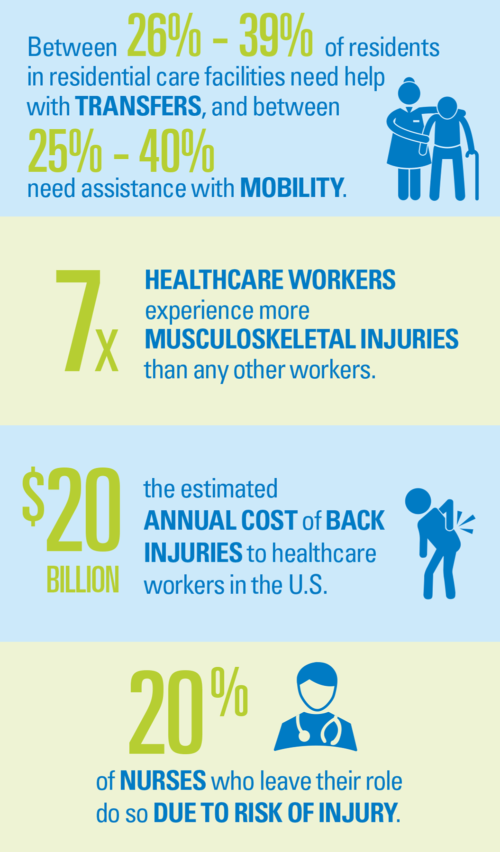 Assisted Living providers must take note that acuity is on the rise. Today, the average resident in Assisted Living is 85 years or older, likely female and needs help with at least three ADLs, including transfer and mobility assistance (Centers for Disease Control, 2015). As age and support needs change and acuity rises, the need to lift and move residents increases, as does the risk for resulting employee and resident injuries.
