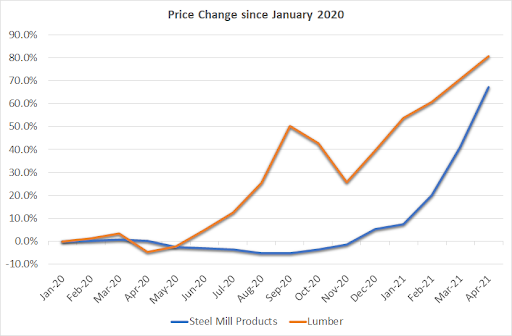 Carl: Product pricing is being driven up by a perfect storm of raw material increases, rising freight rates, supply chain disruption, product scarcity and a labor shortage. Raw materials have increased substantially over the past 12 months. Lumber and steel, for example, are both up nearly 80% in the last year (reference Price Change chart below). Alternatively, on the transportation side, demand to ship products both domestically and internationally has pushed freight rates higher. The inability to ship or get product at times has also led to product scarcity and supply chain disruptions which also pushes product pricing up. Finally, add to all this a labor shortage that is causing companies to have to pay more to compete for labor which they then pass along through price increases. All these factors together create an environment that will continue to push prices upward in the coming months.