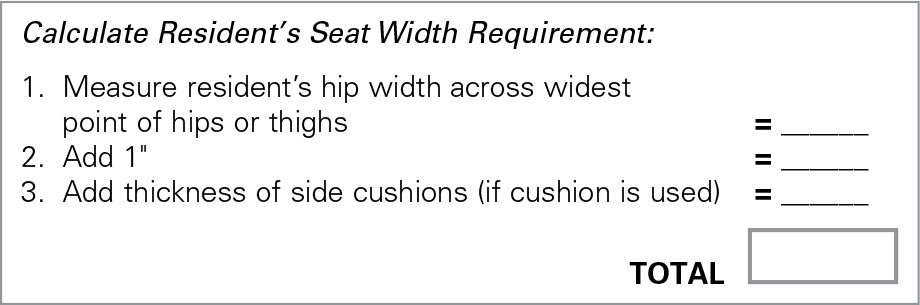 - Measure the resident’s hip width across the widest point of hips or thighs