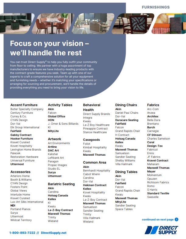 Count on Direct Supply® to outfit your community from floor to ceiling with ease. Our strong partnerships with top manufacturers give you access to industry-leading products designed with the contract-grade features that different environments demand. Let our procurement experts handle the sourcing and logistics, delivering the equipment and furnishings you need to bring your vision to life—down to the last detail..
