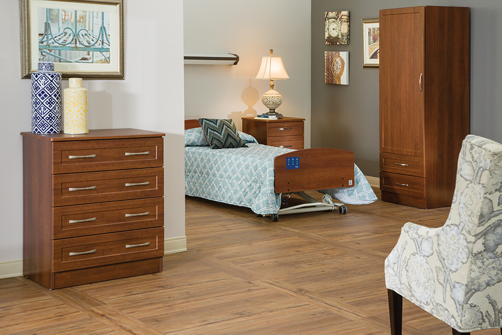 Timeless casegoods offer a clean look in any resident room – no matter the latest trend. Sleek designs, like the Arlington Collection, can flex to any aesthetic based on the fabrics and finishes you select. Consider choosing popular light finishes for an on-trend vibe, or stick to a traditional feel by selecting cherry or mahogany. This collection’s durable 3D laminate construction offers long-lasting style, while toe kicks that extend to the floor make cleaning easier since debris won’t get trapped underneath.