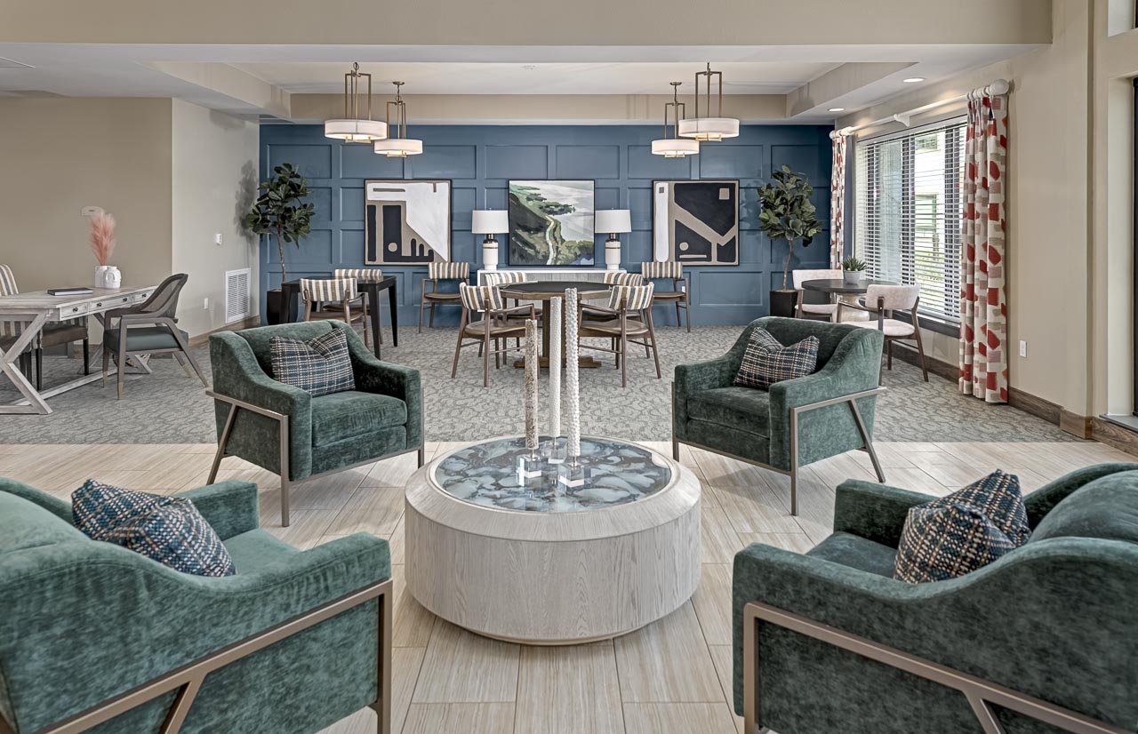 Jewel tones may seem like a bold choice for senior living spaces, but when applied thoughtfully, they can create a striking and transformative atmosphere. Imagine a cozy ‘scholar’s lounge,’ where rich sapphire blue walls are paired with gleaming gold accents and the warm texture of deep leather furniture. In a dining room, emerald-green upholstery adds a regal elegance that elevates the dining experience into something truly memorable.