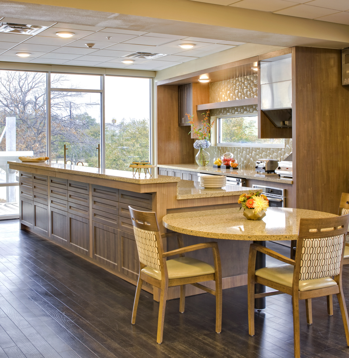 Taking cues from biophilic design, which promotes connectivity to the natural environment, flooding staff spaces with natural light can help boost employee morale. Color can also affect mood and morale, read more about new 2022 color trends in Senior Living.