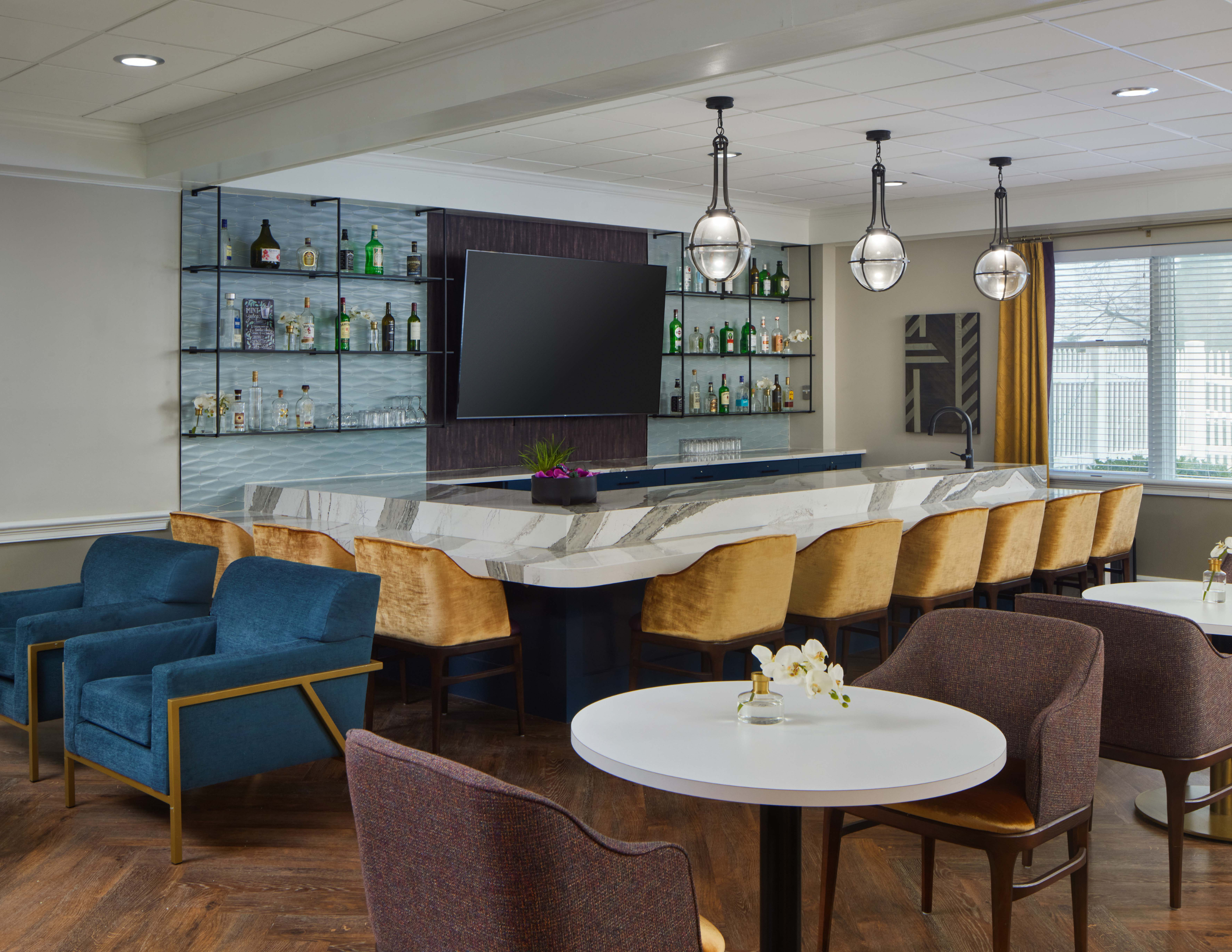 Changes made: Bold artwork, lively fabrics, and a modular layout allowed the space to shift from morning coffee shop to evening wine bar. A large bar with a big-screen TV now anchors the area for casual lunches, happy hours, and game nights.